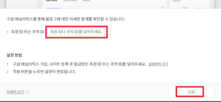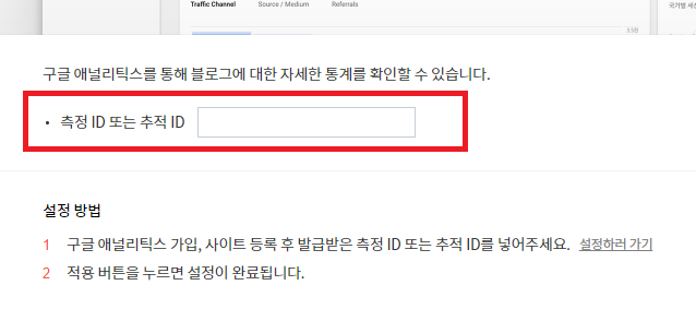 티스토리 블로그 관리자 모드로 들어가서 플러그인에 있는 구글 애널리틱스의 속성 ID 또는 추적 ID 에 붙여 넣기를 하시고 적용을 하시면 됩니다.