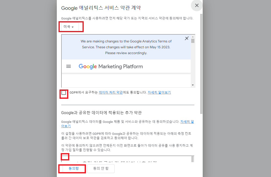서비스 약관 계약은 대한민국 으로 설정하시고 동의합니다 모두를 체크하시면 마무리됩니다.