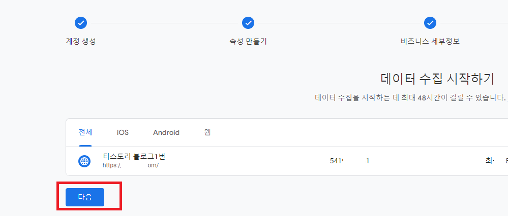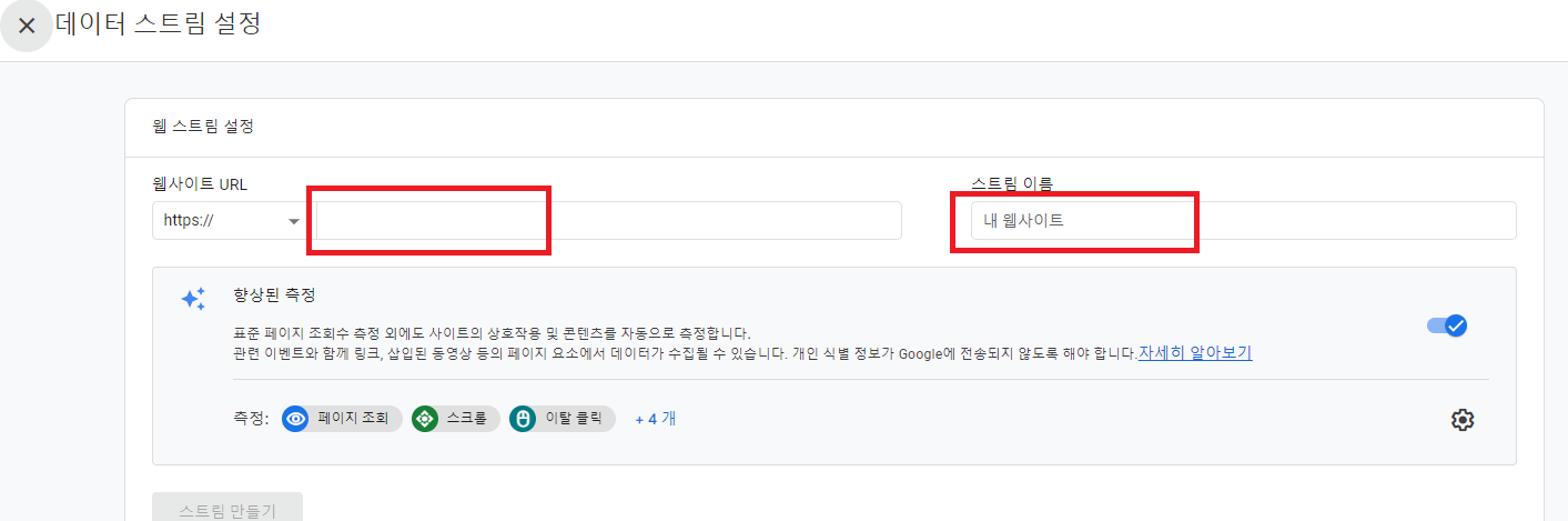 데이터 스트림 설정을 하기 위해 URL 주소를 입력해야 되는데 티스토리 블로그 주소를 쓰시는 분은 티스토리 블로그 주소를 넣으면 되고 도메인을 사용하는 분은 도메인 주소를 넣고 스트림 이름은 본인이 쓰고 싶은 이름을 넣으면 되겠습니다.