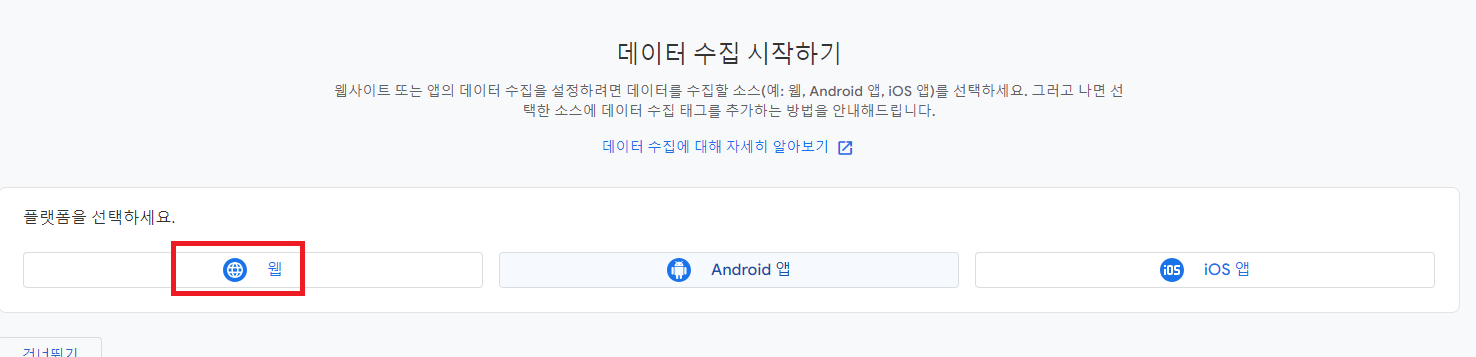 데이터 수집을 하기 위해 플랫폼을 선택을 해야 됩니다. 티스토리 블로그를 운영을 하니 웹으로 선택을 하면 됩니다.