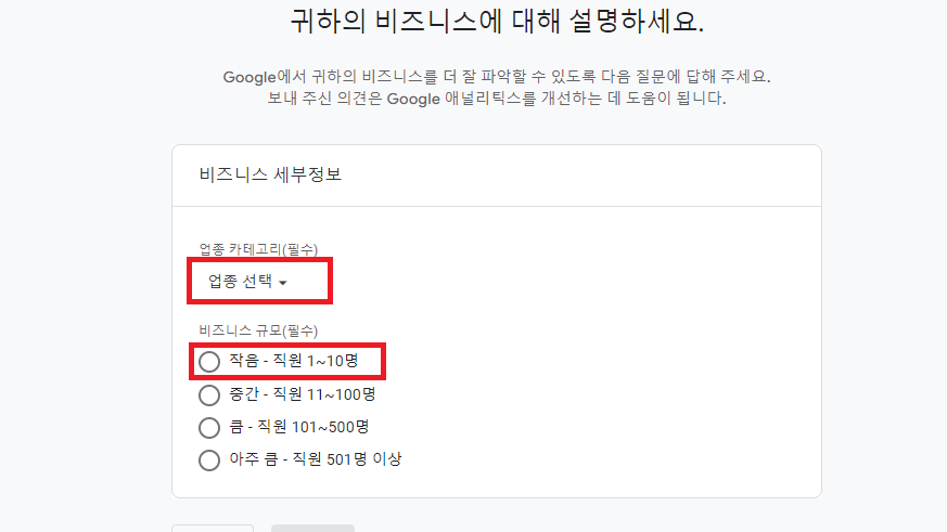 고급설정은 7월1일 부터 제공을 하지 않기 때문에 설정할 필요는 없습니다. 세부설정은 업종은 보통 온라인 커뮤니티로 하면 되고 비지니스 규모는 본인에 맞게 체크하면 됩니다.