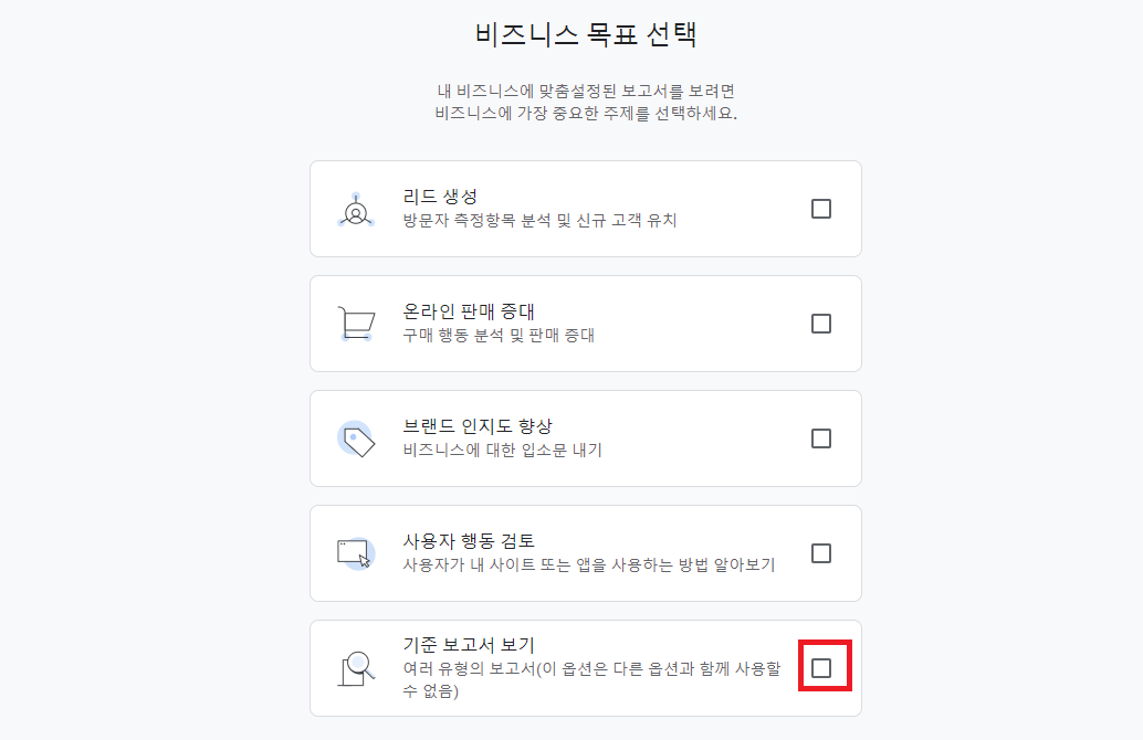 비즈니스 목표는 여러가지가 있지만 보통 구글 상단노출을 위해 체류시간 확인 및 분석을 목표로 하기 때문에 기준보고서 보기를 선택하시면 됩니다. 그리고 만들기 클릭합니다.