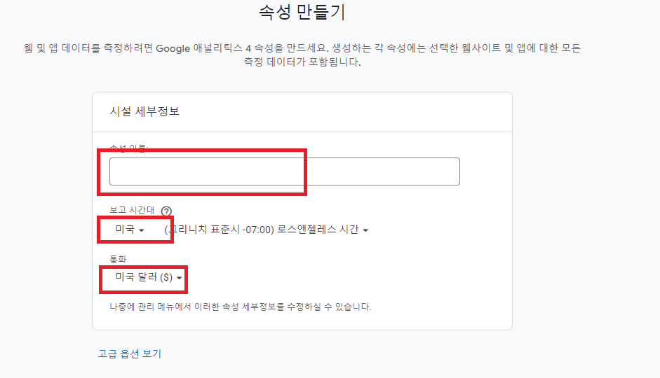 속성이름은 티스토리 블로그 이름을 넣으면 되는데 넣고싶은 이름으로 넣으면 됩니다. 보고서 시간대는 대한민국으로 하시고 통화는 원으로 설정해주시면 됩니다.