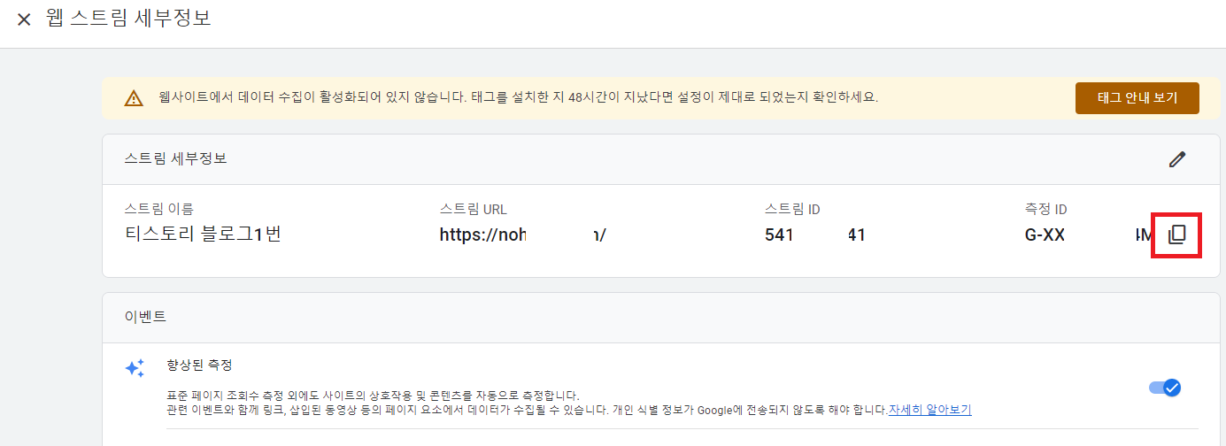 6. 웹스트림 세부정보에서 측정 ID 복사하고 티스토리 블로그 애널리틱스에 붙여 넣기